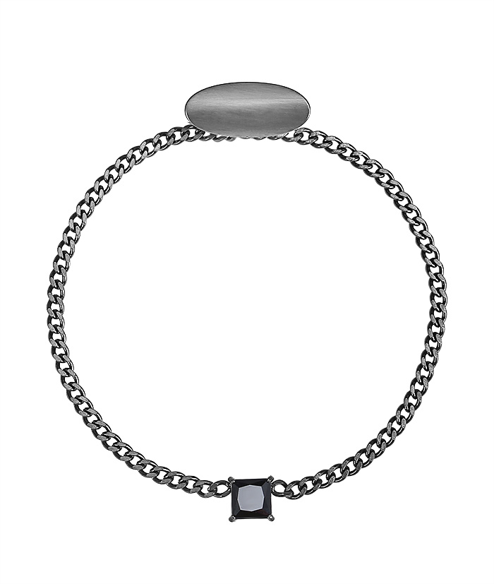 Slipskedja av en 3 mm bred pansarlänk i matt kirurgiskt rostfritt stål med en svart TiCN-plätering (Titanium Carbonitride) med en fyrkantig, svart kristall av kubisk zirkonia.