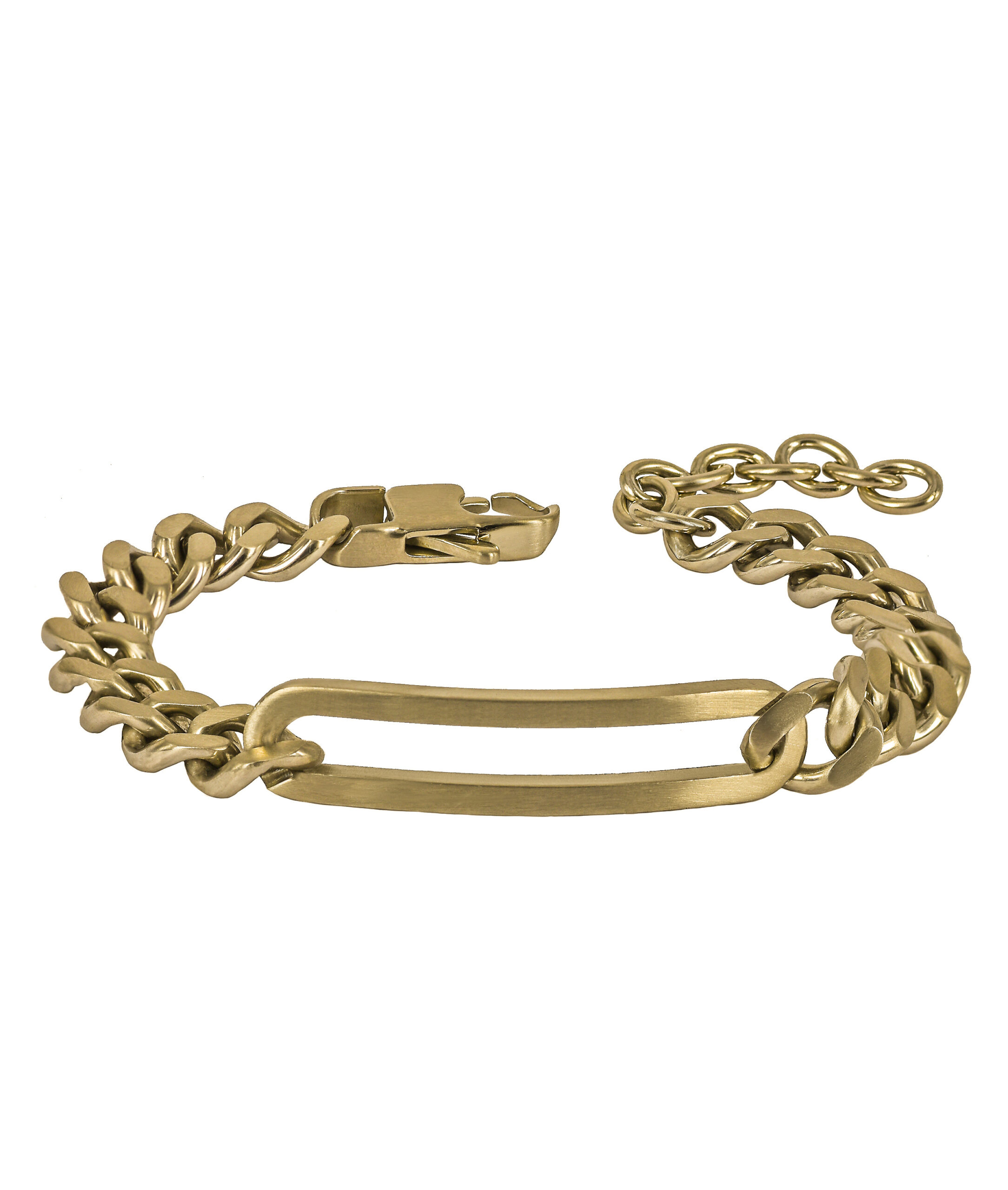 9 mm bred pansarlänk med en öppen, avlång oval ring. Armbandet är tillverkat av 14 karat guldpläterat kirurgiskt rostfritt stål. Matt finish.