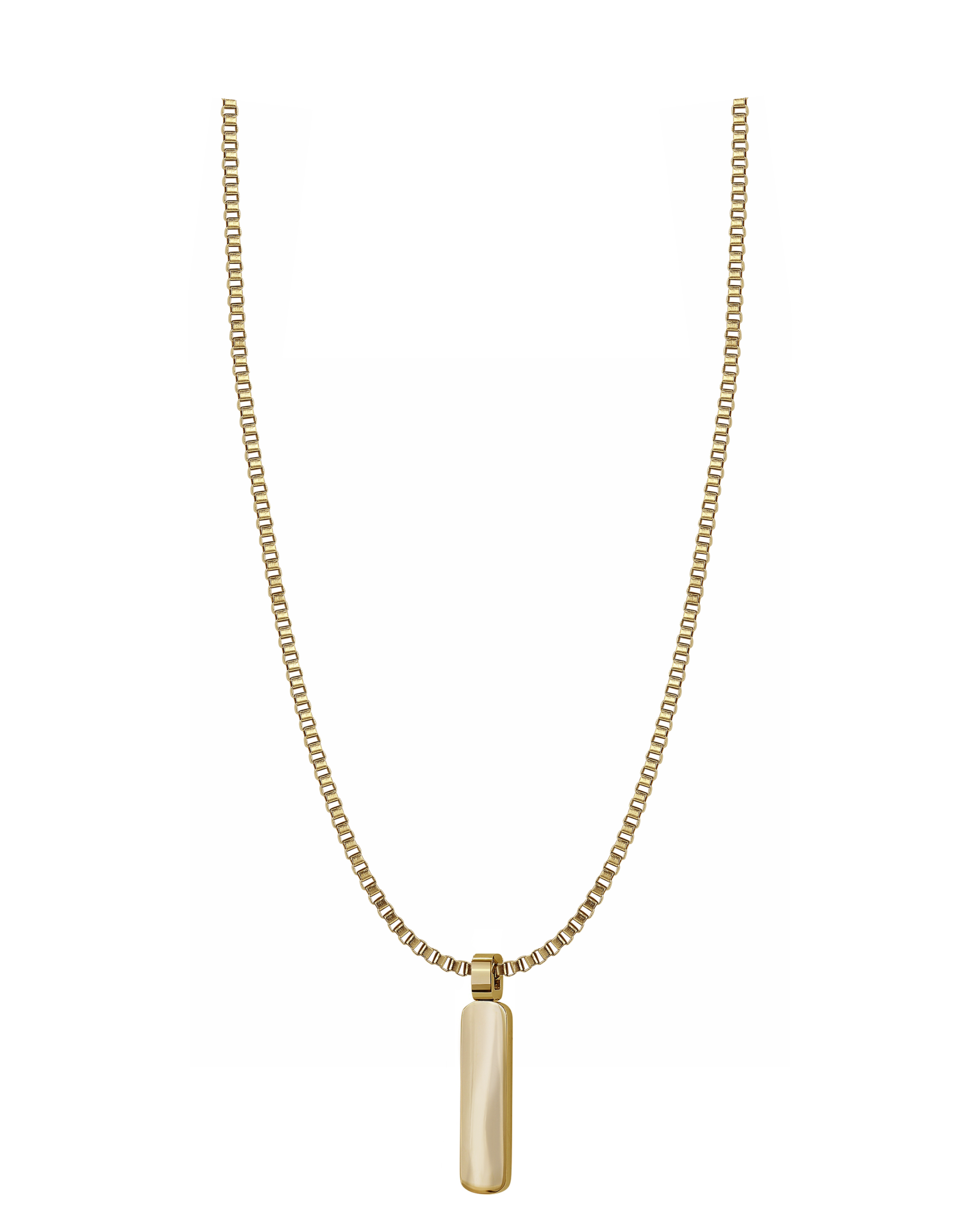 Nätt halsband av en Venezia kedja (boxkedja) och ett långt hänge i 14 karat guldpläterat kirurgiskt rostfritt stål. Polerad finish. Halsbandet kan göras längre eller kortare, beroende på kundens preferens.