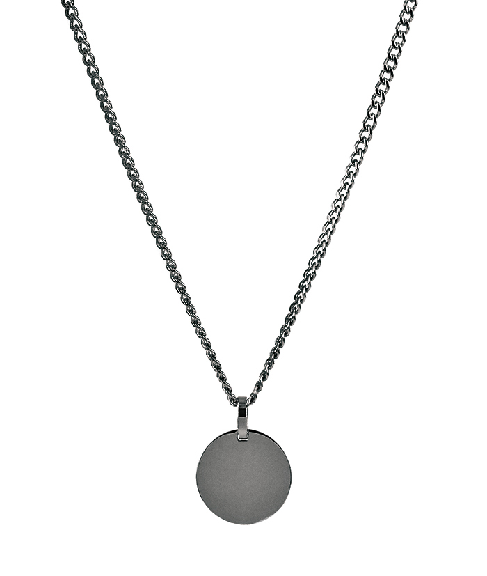 Nätt halsband av en pansarlänk i kirurgiskt rostfritt stål och Svart TiC (Svart Titan Karbid) PVD plätering. Halsbandet har ett hänge i form av en rund bricka – en sida är matt och den andra polerad.