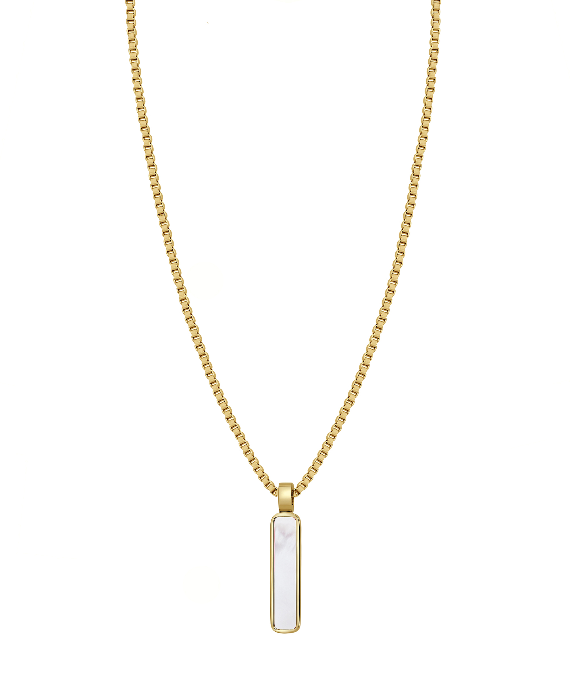 Nätt halsband av en Venezia kedja (boxkedja) och ett långt hänge i 14 karat guldpläterat kirurgiskt rostfritt stål dekorerat med pärlemor. Polerad finish. Halsbandet kan göras längre eller kortare, beroende på kundens preferens.
