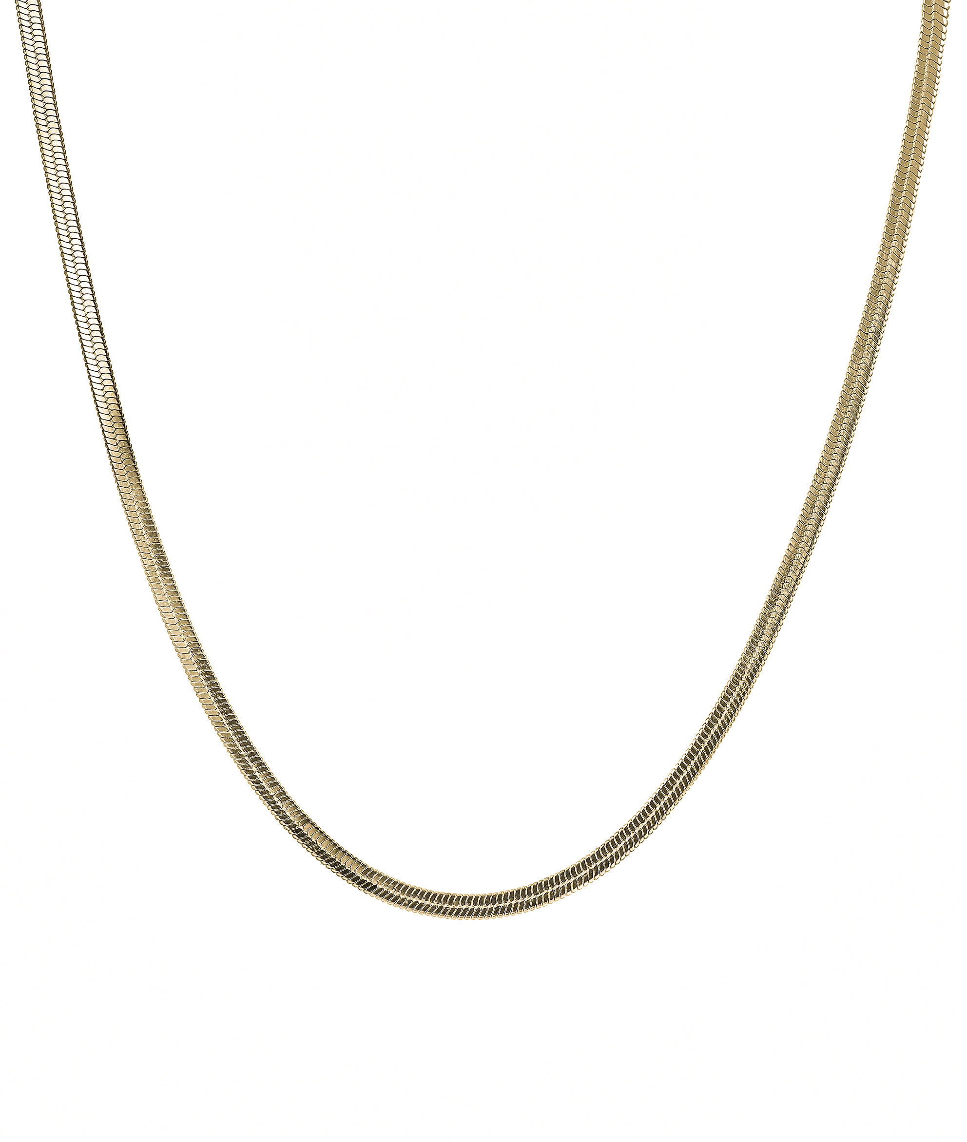Perfekta bas-halsband av en bred, platt Herringbone kedja i 14 karat guldpläterat kirurgiskt rostfritt stål. Polerad finish.