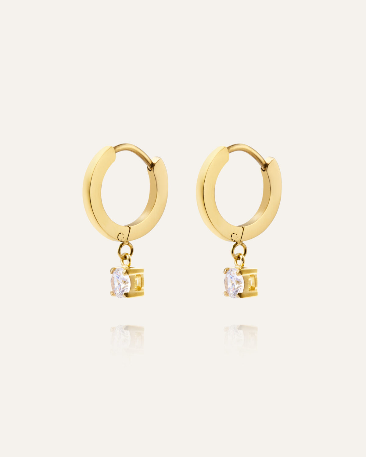 Jolie Gold Hoops är en modern tolkning av klassiska hoops. Tillverkade i hållbart stål med guldplätering och PVD-plätering, erbjuder dessa vattentåliga örhängen en unik balans mellan enkelhet och sofistikation. Örhängenas vita stenar och tidlösa guldramar gör dem till en perfekt accessoar för alla tillfällen. Örhängena är även vattentåliga så att du kan bära dem varje dag.