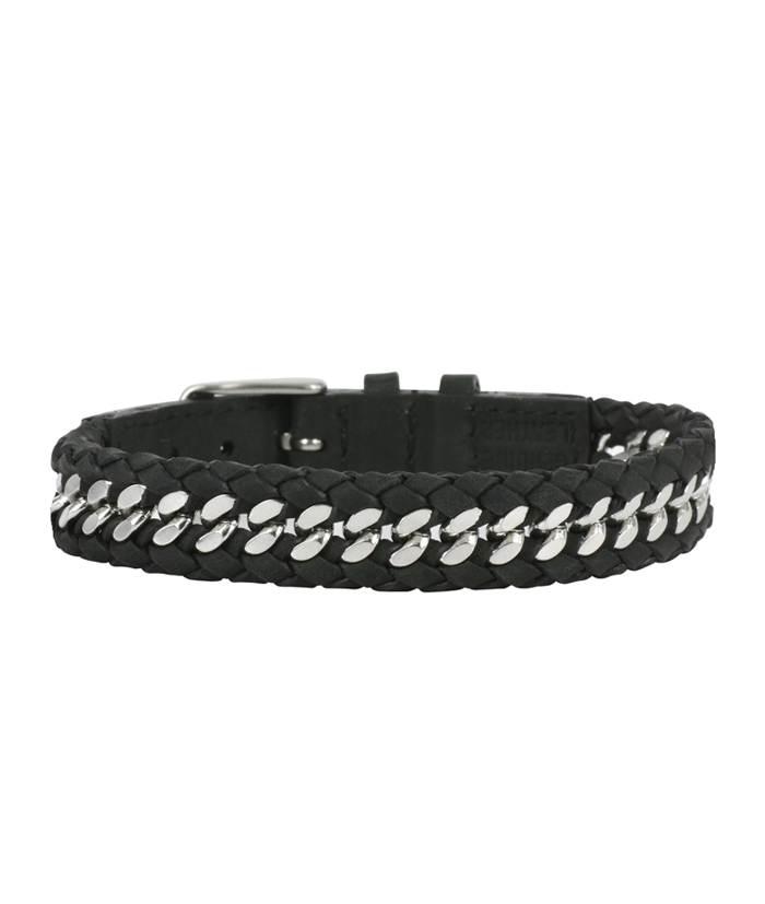 Flätat läderarmband med spänne och lås samt en dekorativ kedja som löper runt hela armbandet av kirurgiskt rostfritt stål. Det justerbara spännet ger en säker passform och gör armbandet enkelt att anpassas efter handleden. Armbandet är av matt finish.