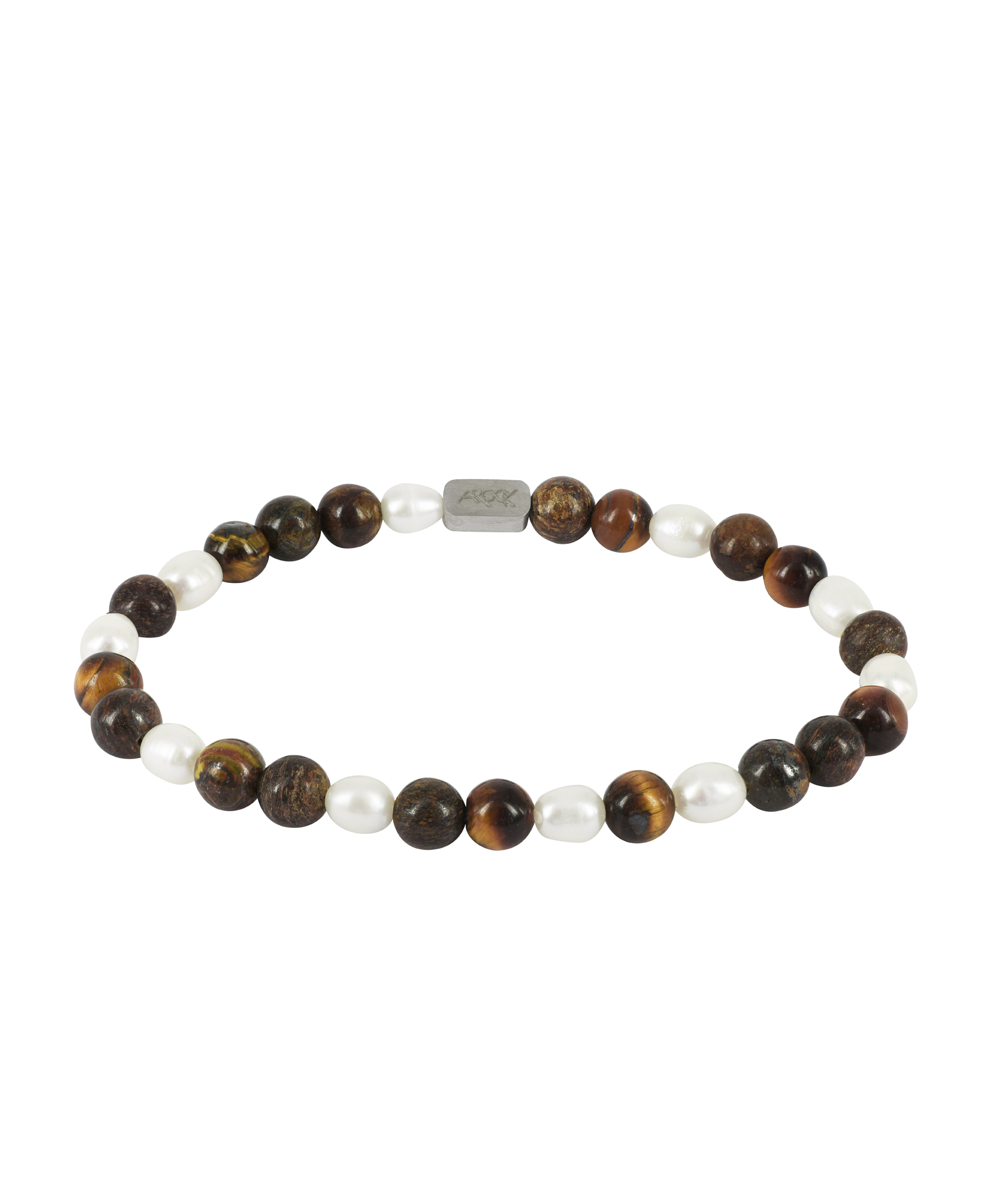 Elastiskt kularmband av ädelstenar från Tigeröga och Bronzit samt äkta sötvattenspärlor. Notera att vi använder oss av äkta pärlor, vilket innebär att form, storlek samt nyans på pärlorna kan variera. Detaljer i kirurgiskt rostfritt stål, matt finish.