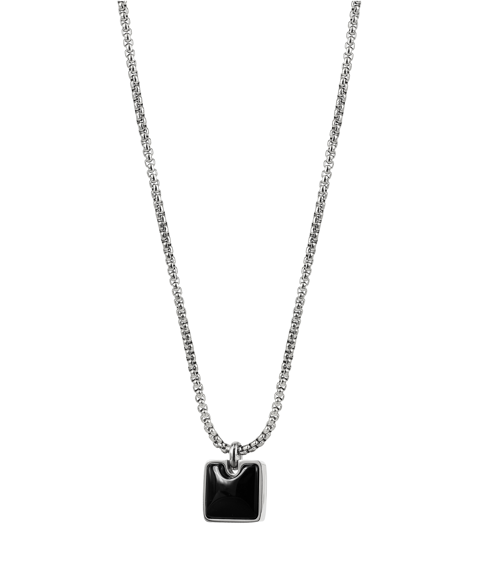 En nätt rundad boxkedja i kirurgiskt rostfritt stål med ett fyrkantigt hänge av ädelstenen Onyx. Polerad finish.