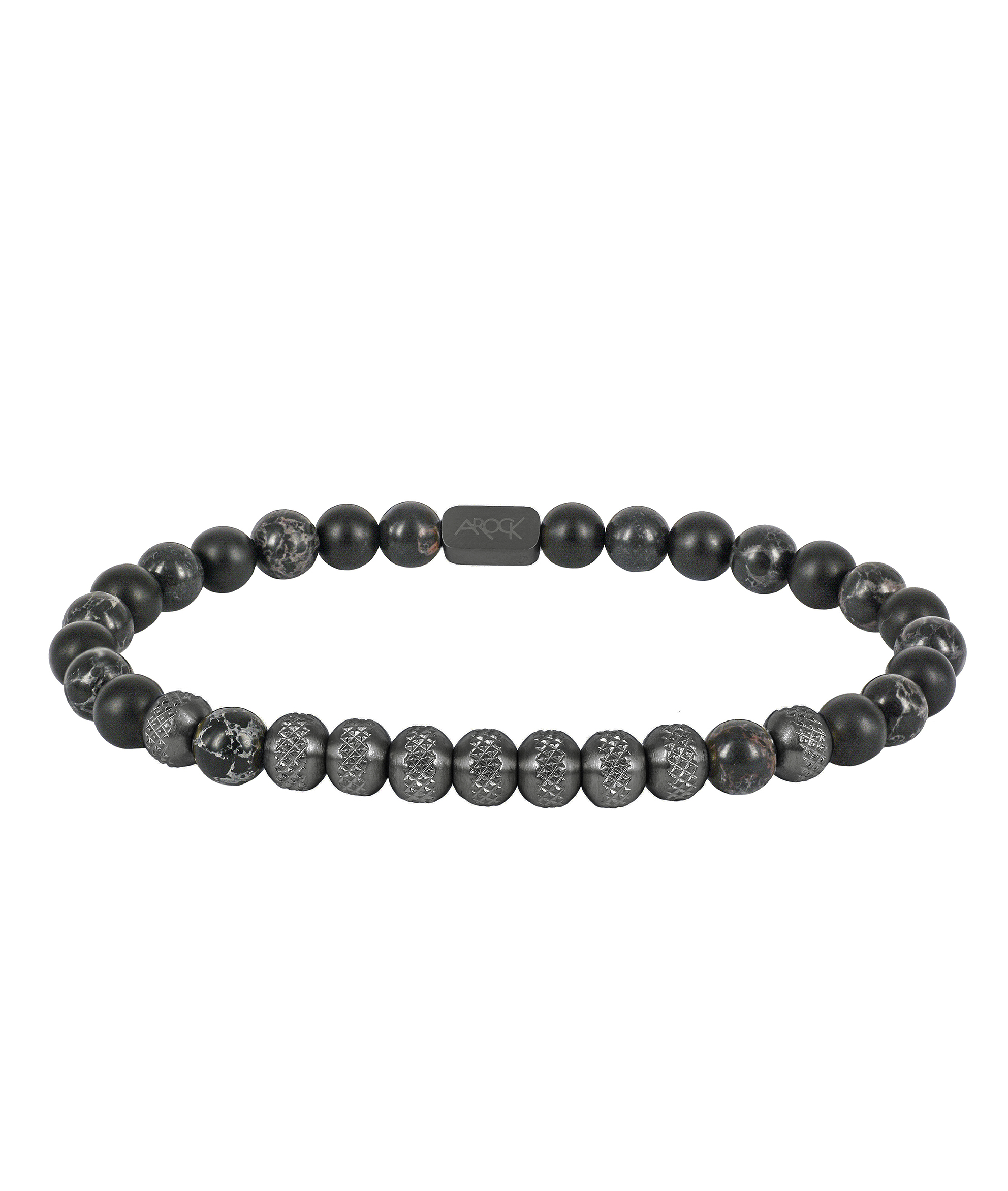 Elastiskt kularmband av ädelstenar från Bronzit och Onyx mixade med matta, texturerade kulor av kirurgiskt rostfritt stål med en TiCN-plätering (Titanium Carbonitride).