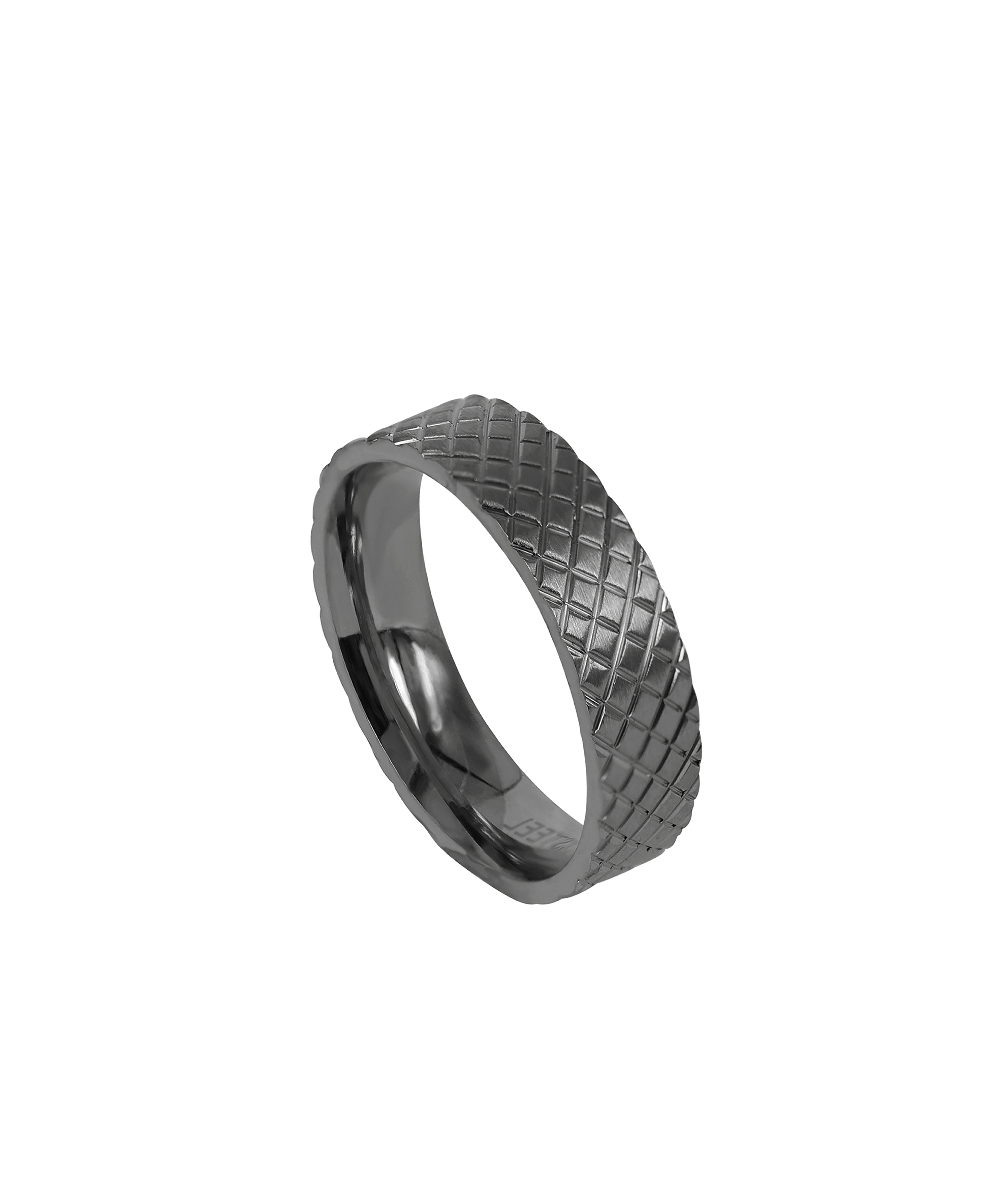 Ring tillverkad av kirurgiskt rostfritt stål med en svart TiCN-plätering (Titanium Carbonitride) med matt finish och texturerad yta.