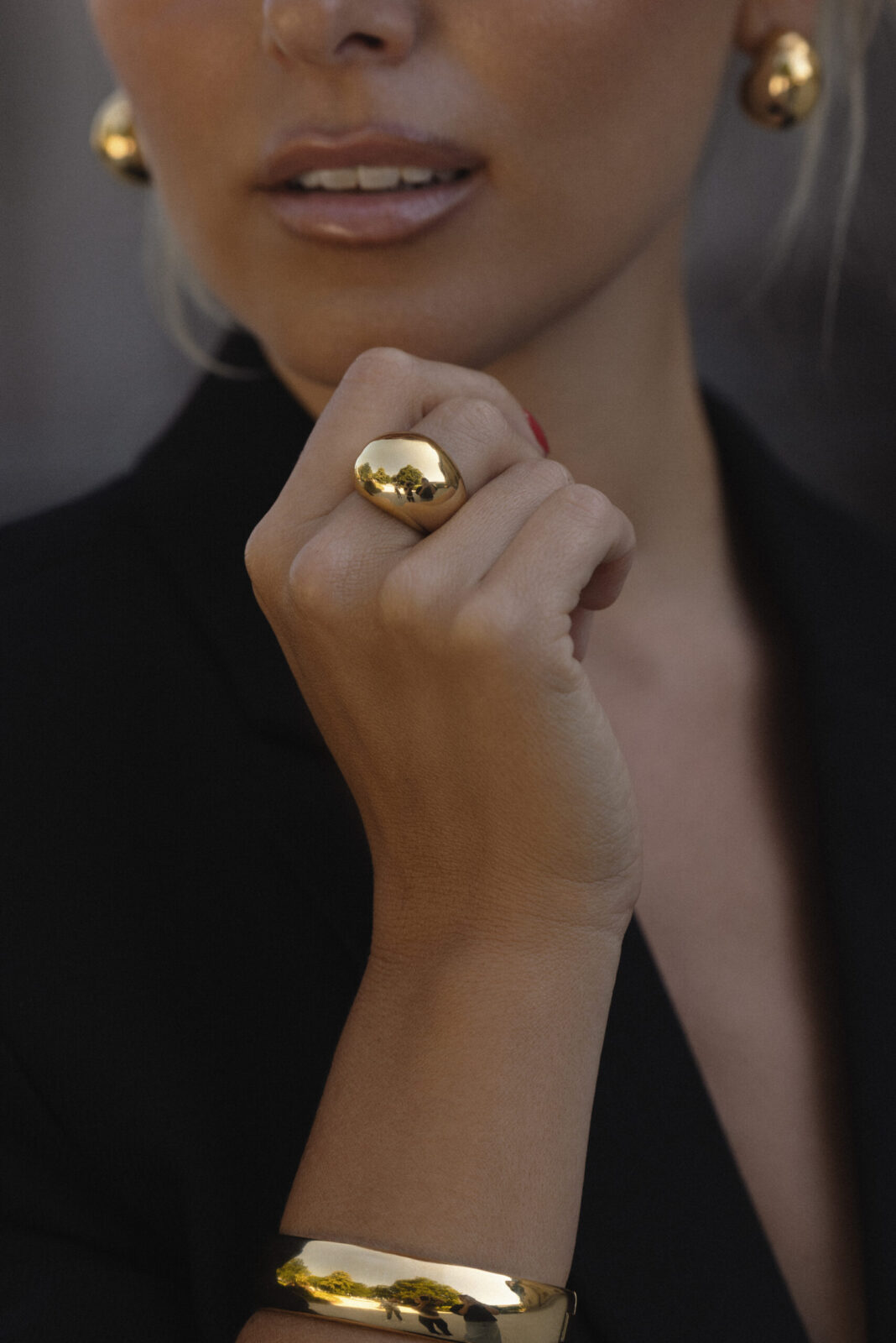 Sonja Ring är en slät, statement-ring som verkligen drar blickarna till sig. Jag älskar att matcha den med Sally Earrings och Alexandra Bangle för en stilren och sofistikerad look. Tänk dig denna eleganta kombination tillsammans med en helsvart outfit – den perfekta mixen av minimalism och lyx!