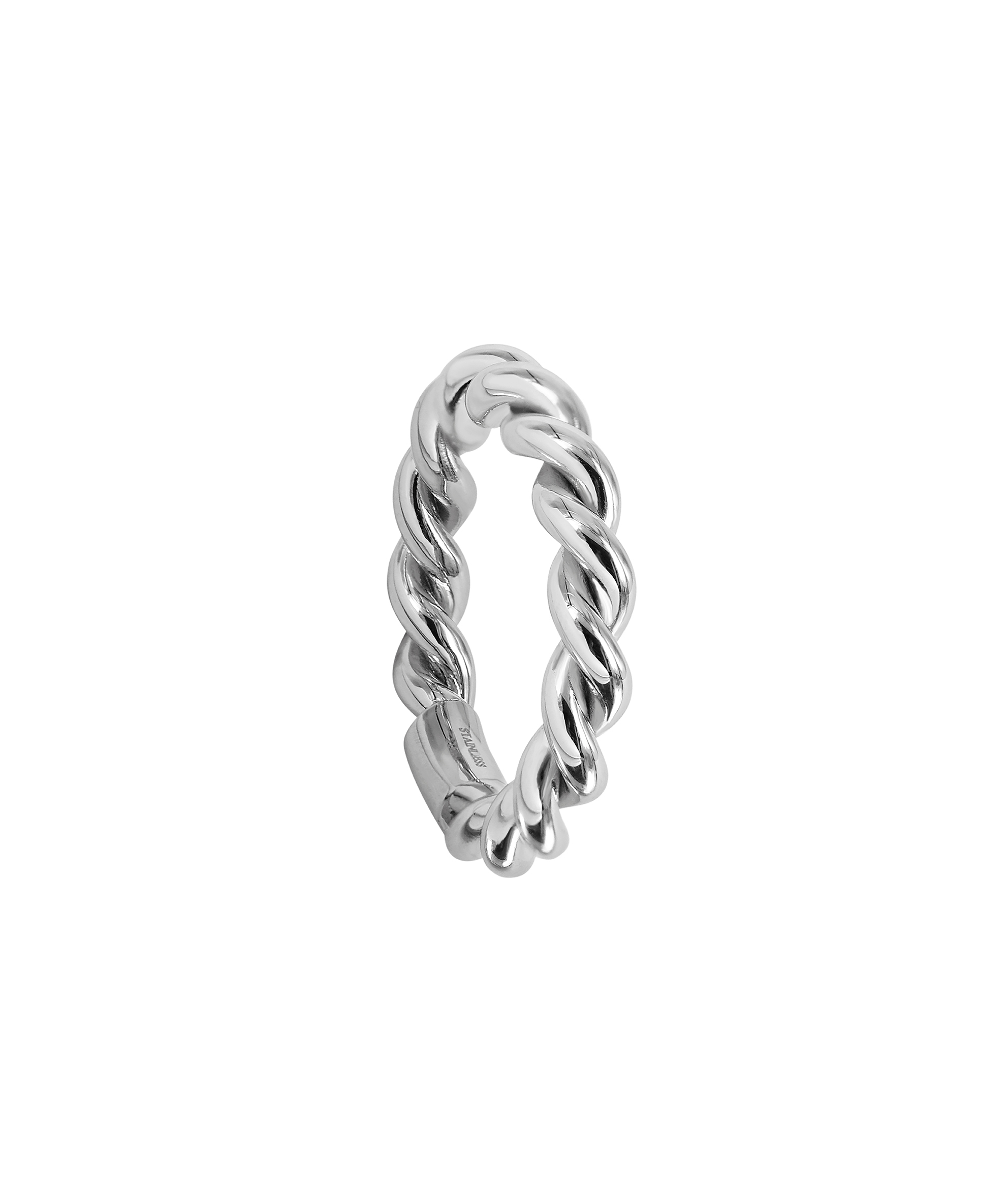 Ring i vriden design, tillverkad av kirurgiskt rostfritt stål med polerad finish.