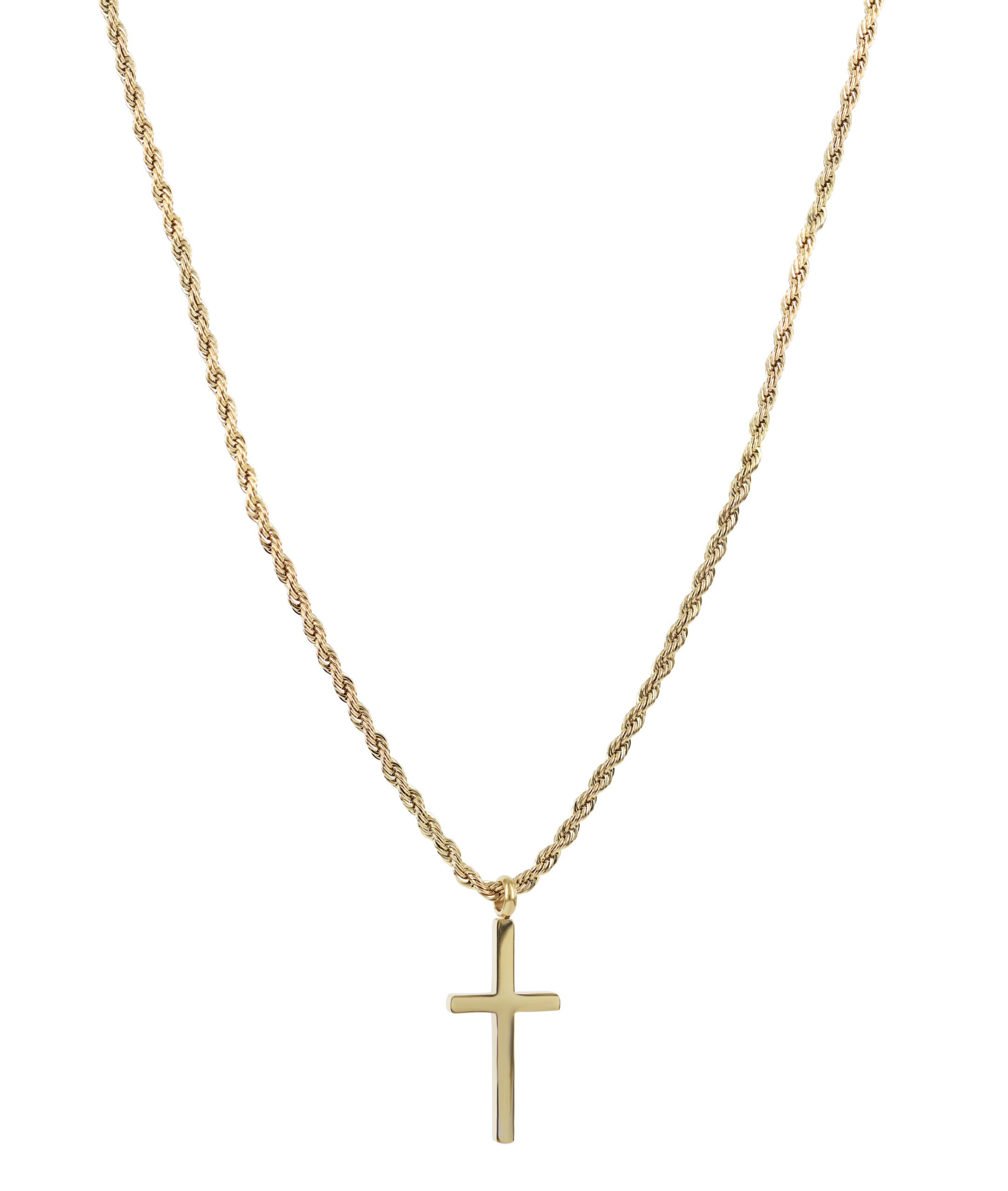 Kort, nätt halsband av en cordellänk i 14 karat guldpläterat kirurgiskt rostfritt stål. Halsbandet har även ett dekorativt kors som har en matt och en blank sida.