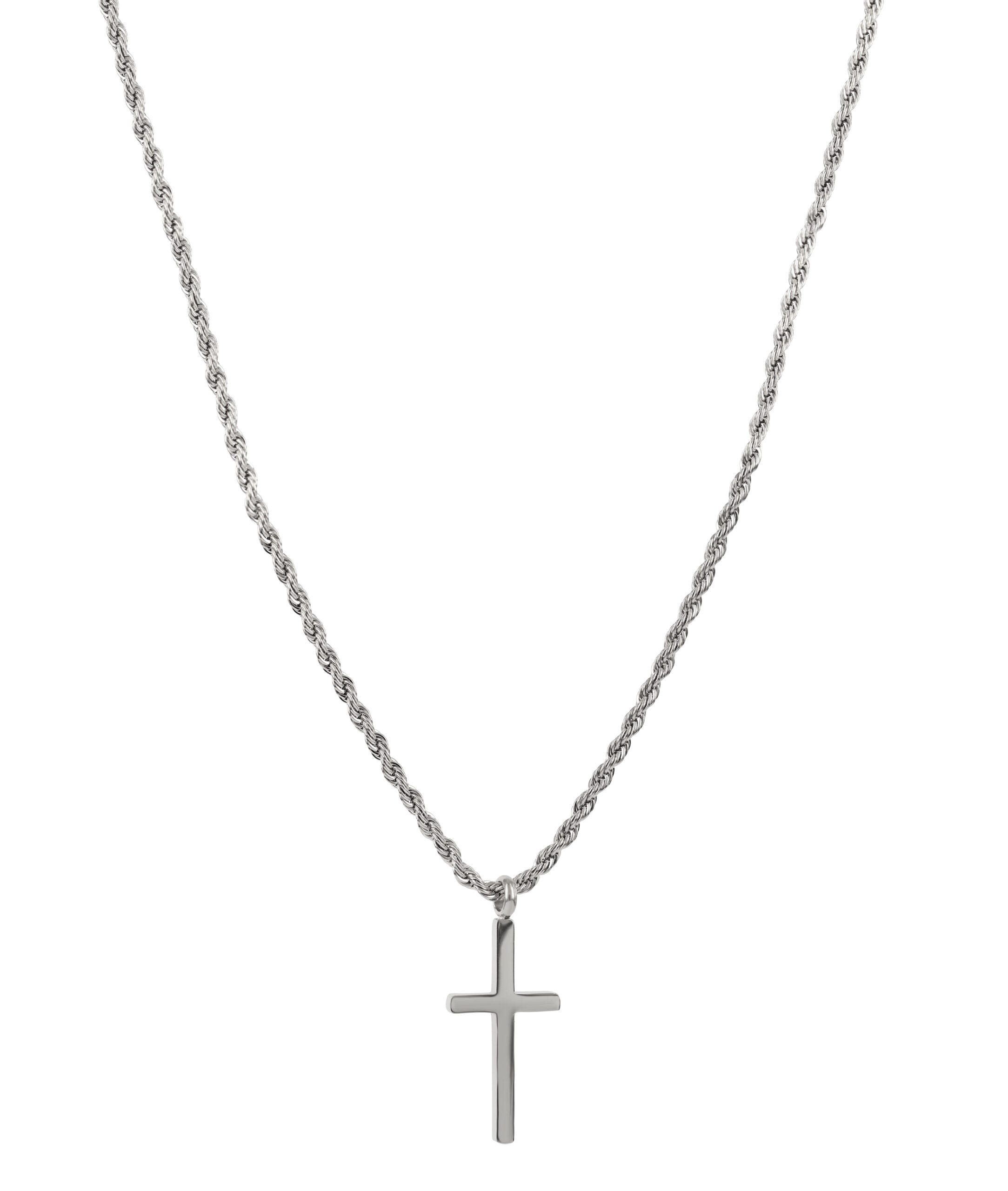 Kort, nätt halsband av en cordellänk i kirurgiskt rostfritt stål. Halsbandet har även ett dekorativt kors som har en matt och en blank sida.