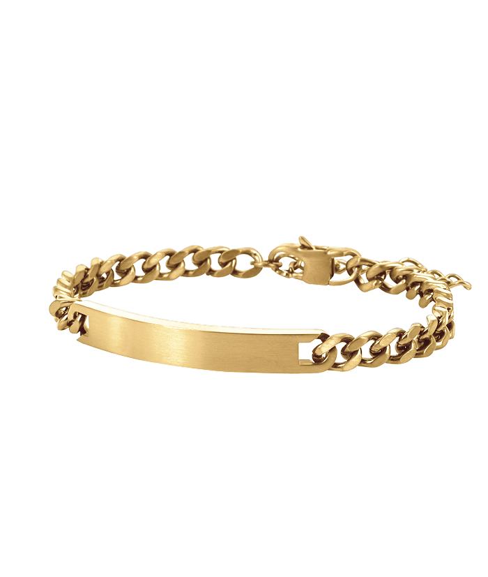 6 mm bred pansarlänk med en rektangulär platta. Armbandet är tillverkat av 14 karat guldpläterat kirurgiskt rostfritt stål och har en matt finish.